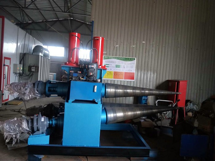錐形卷板機卷板進程與進程主要有以下三步,先將工件送進輥式卷板機的作業輥內,一個輥在工件的上方,稱為上輥,兩個在工件下方,稱為下輥,這是三輥卷板機;四輥卷板機有三個輥在工件的下方,一個在上輥的同一鉛垂面內,稱為中下輥,另兩個在上輥的兩邊,稱為側輥,上輥可與側輥和中下輥中恣意兩個輥對工件進行曲折。